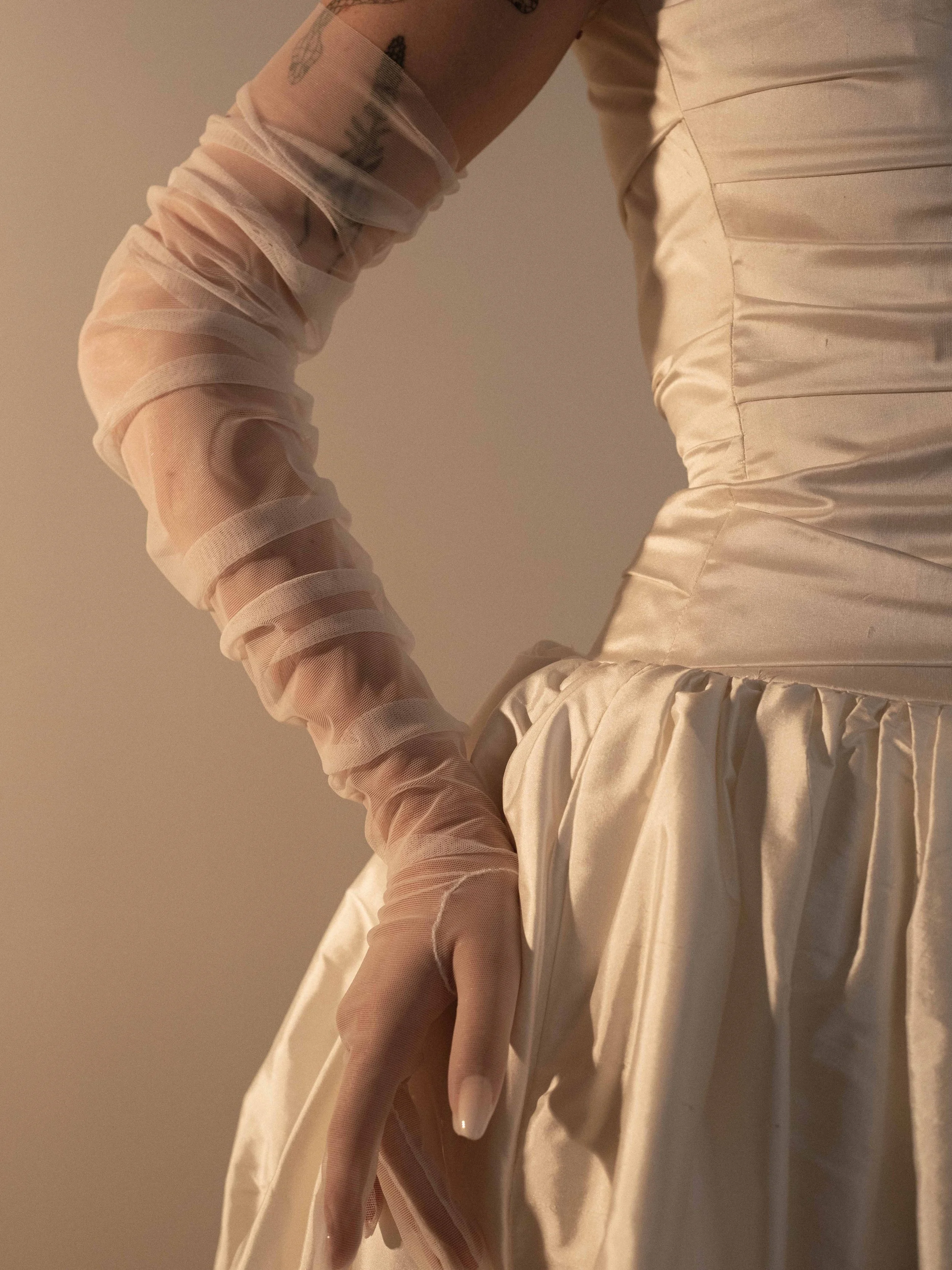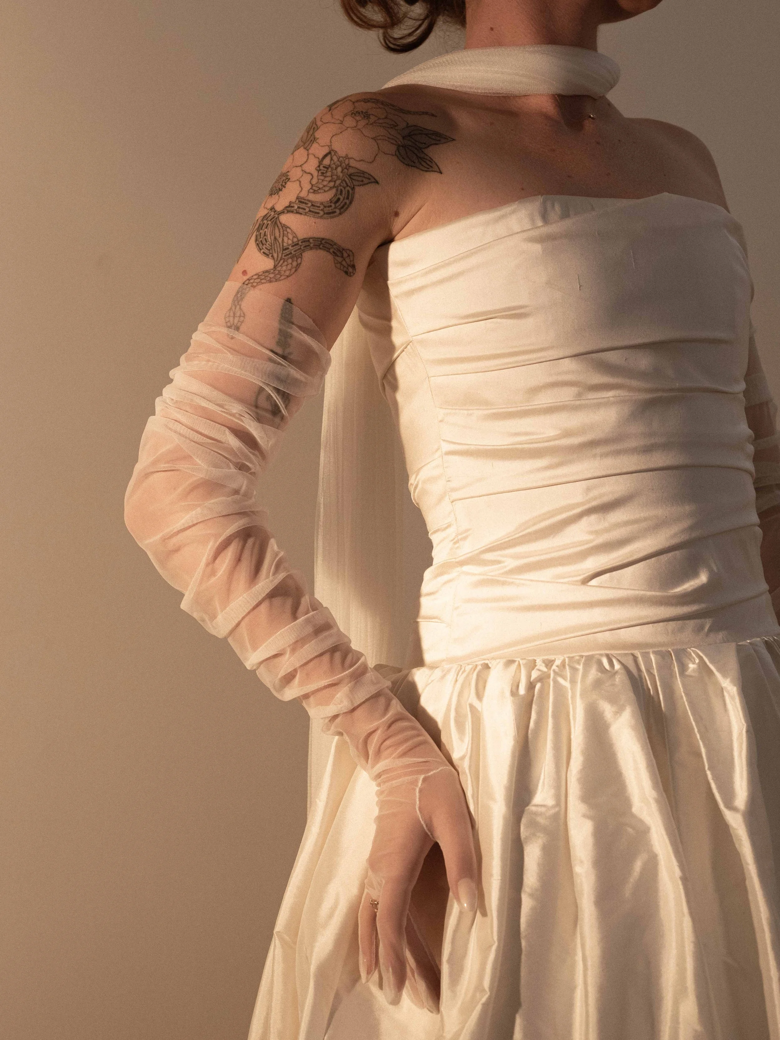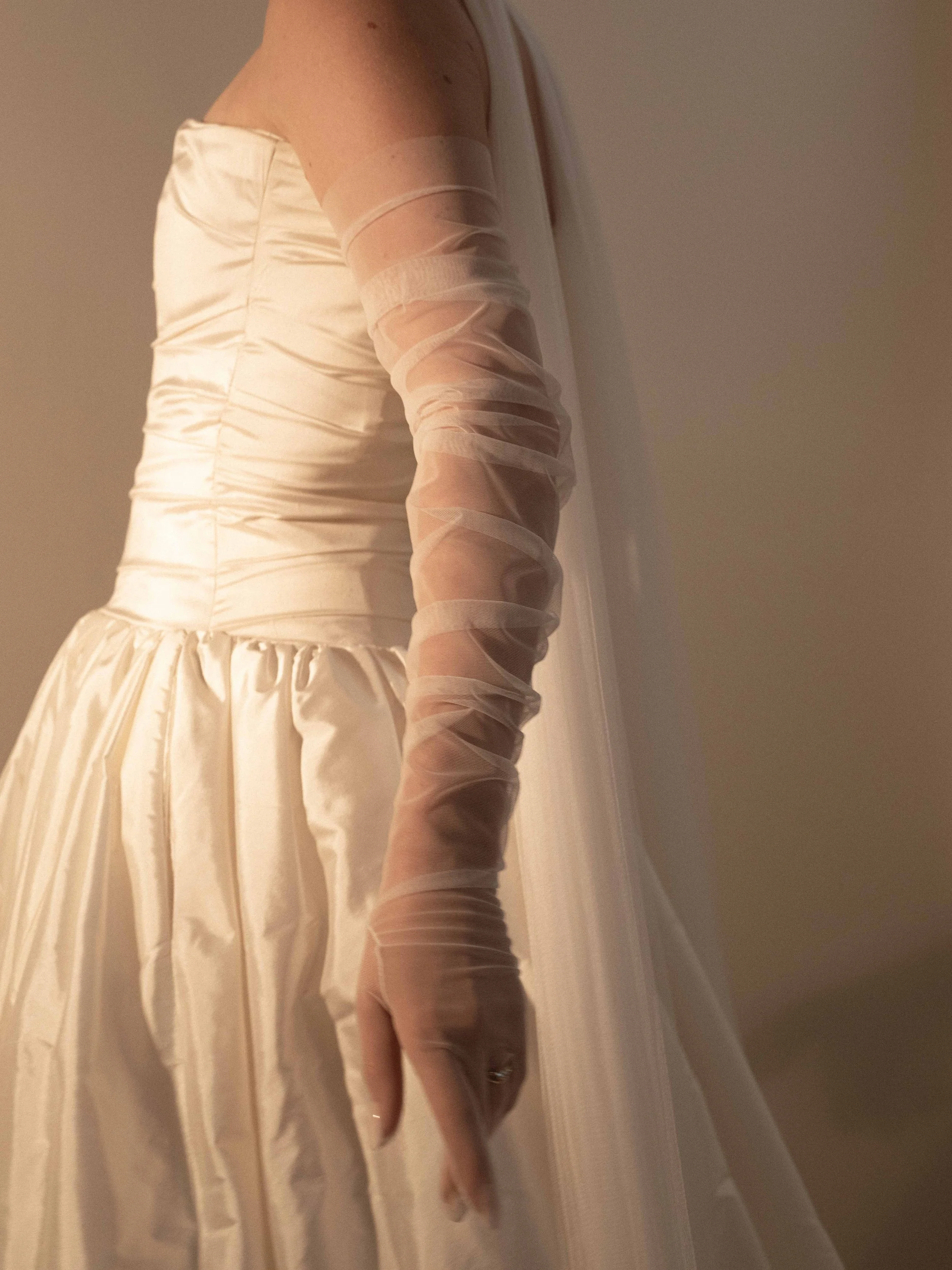 This design is also available as a half glove - identical in style, but without fingers. Perfect for brides seeking more freedom of movement while preserving the refined look.