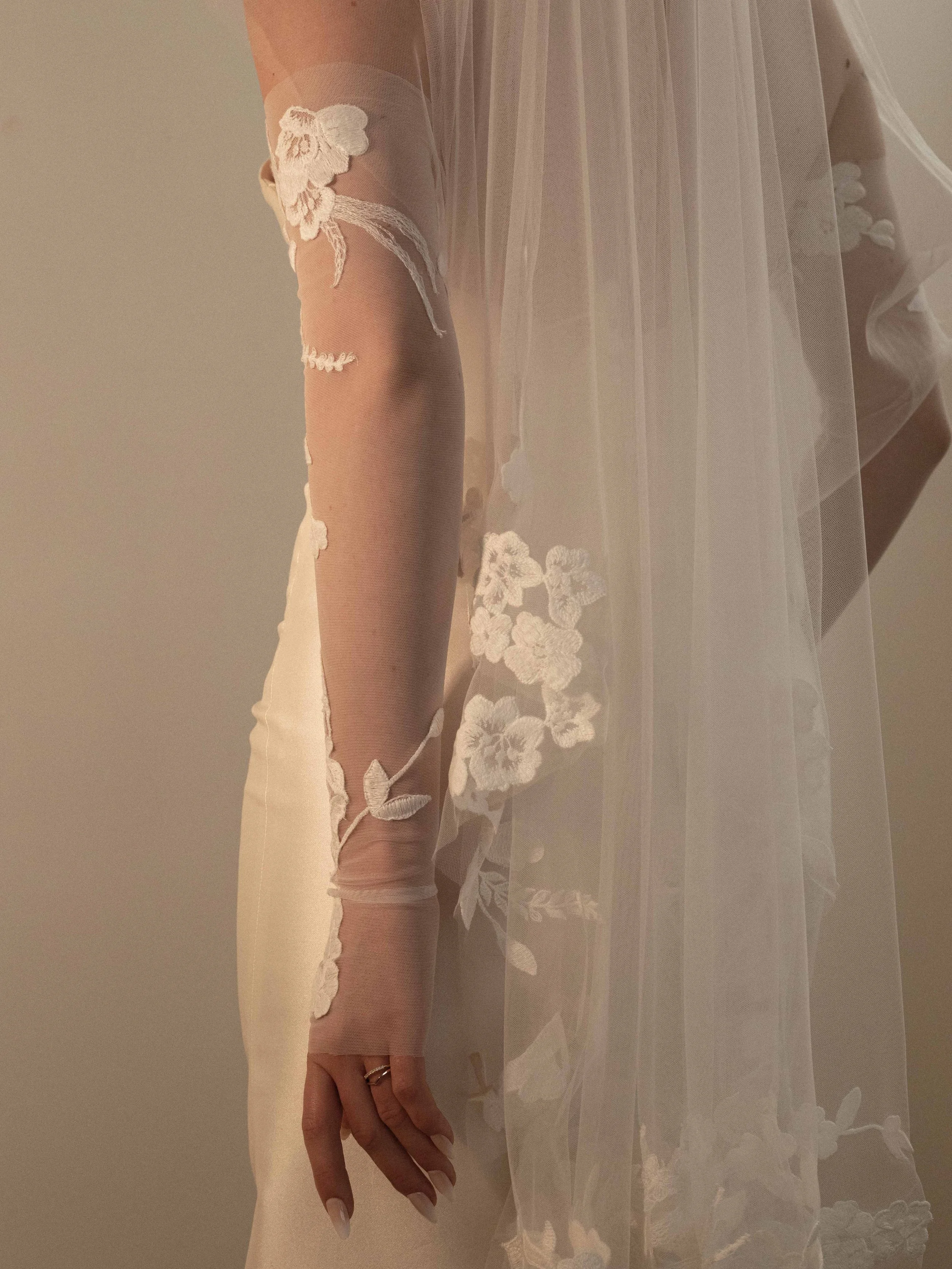 Tulle: 100% PA. Metal comb. All veils are lovingly crafted in Zaandam, the Netherlands.